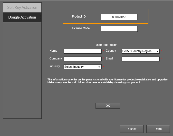 CATATAN : ID Produk dibentuk oleh 8-bit dengan angka dan huruf bahasa Inggris. Anda hanya perlu menginstal ulang atau mencolokkan dongle lagi jika ID produk tidak benar..