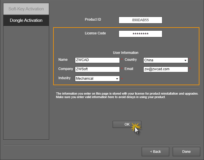 5. Isi Kode Lisensi dan Informasi Pengguna Anda, lalu klik OK untuk mengaktifkan produk.